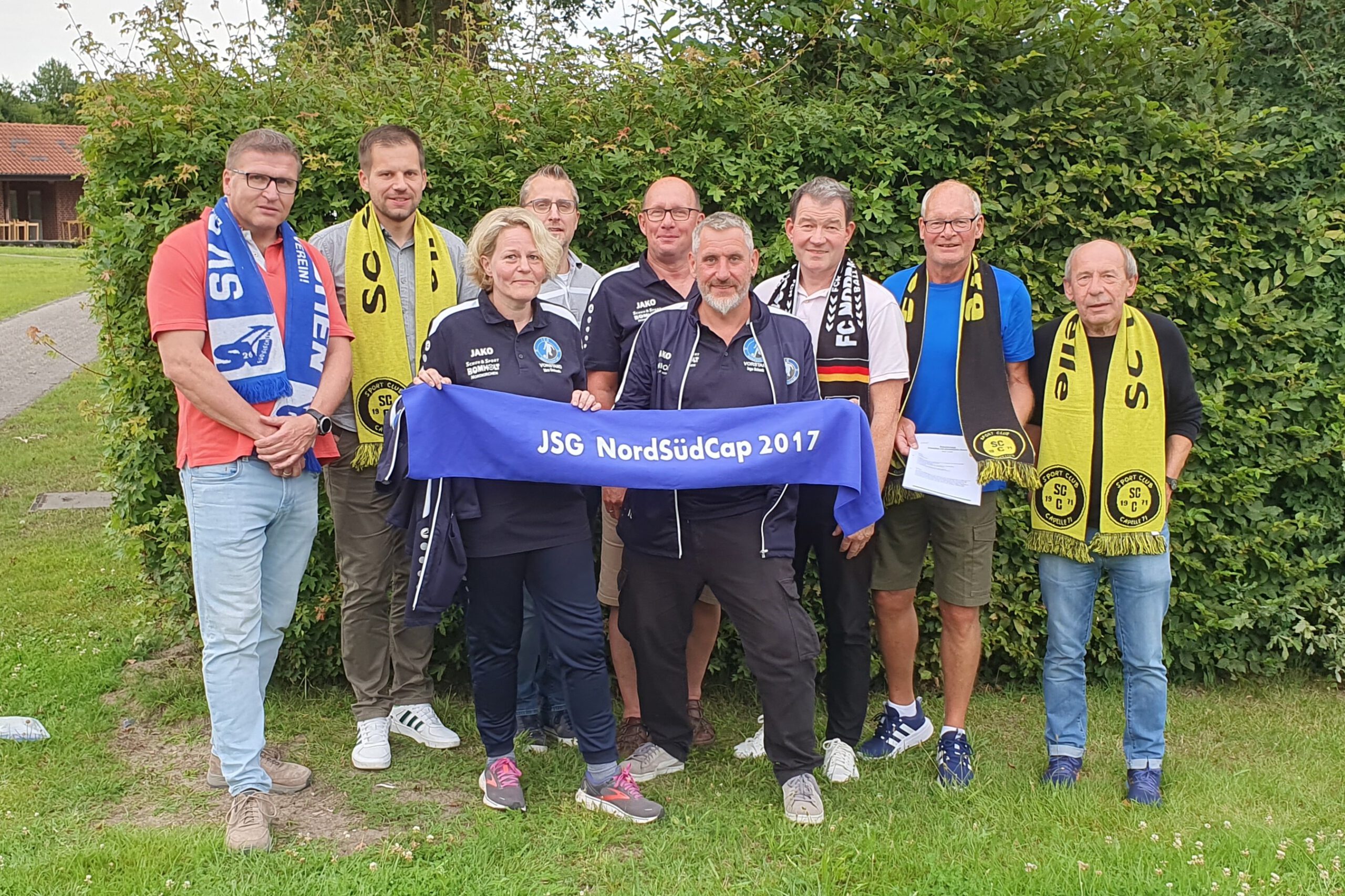 (V.l.n.r.): SV- Präsident Ludger Hörstrup, Sebastian Mertens (Kassierer SC Capelle), Vera Greferath (JSG), Christian Quante (Geschäftsführer SC Capelle), Rüdiger Willms (JSG), Ingo Schock (JSG), Dietmar Koch (Vorsitzender FC Nordkirchen), Josef Mertens (Vorsitzender SC Capelle), Kurt Gumprich (SC Capelle)