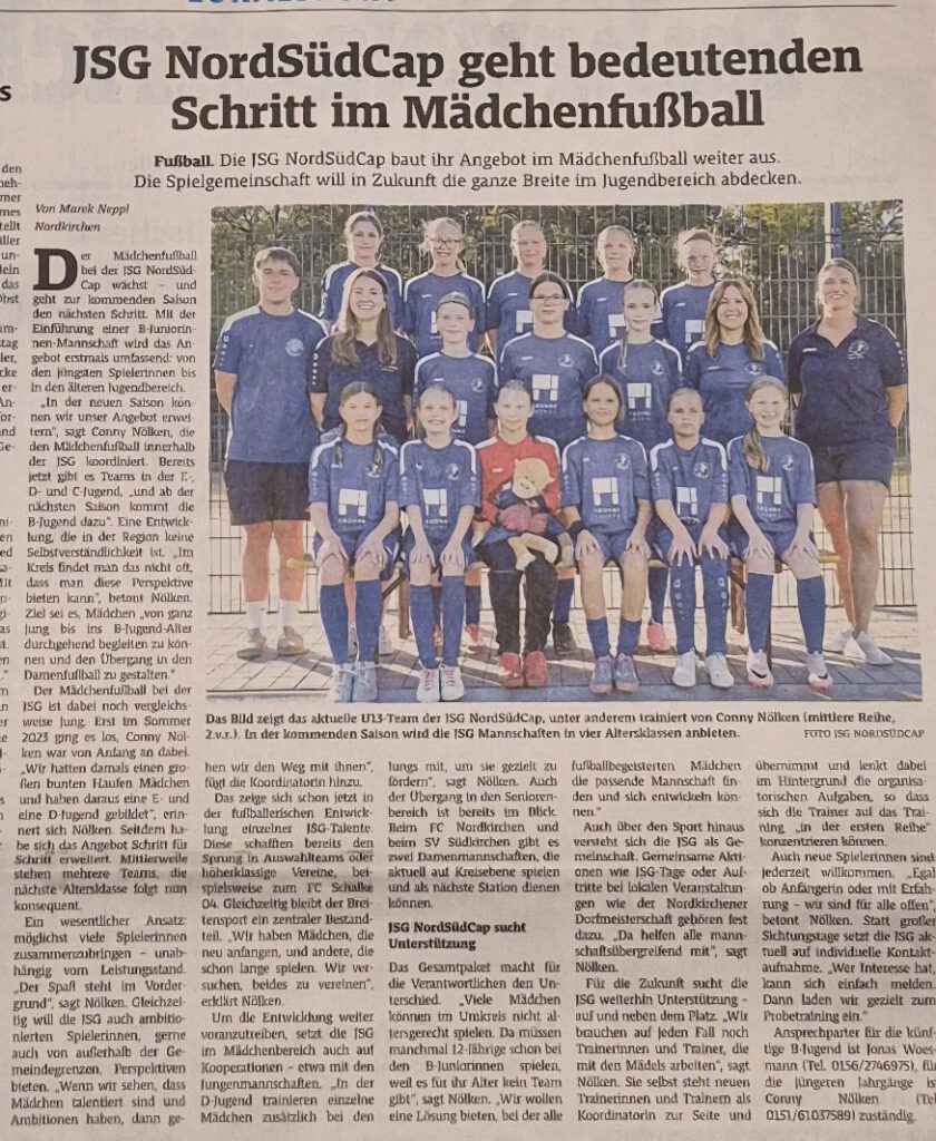 Zur neuen Saison 2026/27 wird die JSG das 4. Mädchenteam gründen, die B-Juniorinnen (U17). Damit wären dann alle Altersklassen abgedeckt und wir könnten den fußballbegeisterten Mädchen eine durchgehende Spielmöglichkeit bieten. Doch damit nicht genug: Nach ihrer Jugend könnten alle dann direkt in eine der beiden Damenteams wechseln, entweder beim FC Nordkirchen oder dem SV Südkirchen. Sie könnten also Ihre gesamte sportliche Laufbahn bei uns verbringen. Mit Conny Nölken haben wir eine engagierte Koordinatorin, die unsere Mädchenteams nicht nur gegründet und aufgebaut hat, sondern diese noch weiterentwicklen möchte. Sie hat jahrelang selbst gespielt, kann also allen Mädchen viel beibringen. Daher suchen wir besonders auch Mädchen, die schon eine gewisse “Erfahrung” haben und sich weiterentwicklen wollen. Natürlich sind auch “Anfängerinnen” herzlich willkommen. In einem unverbindlichen Gespräch können alle weiteren Infos eingeholt werden. Auch ein Schnuppertraining ist möglich. Spielerinnen, die noch bei einem anderen Verein angemeldet sind, benötigen dazu aber eine Einverständniserklärung. Diese ist vor dem “Schnuppertraining” vorzulegen. Weitere Infos>> Hier Klicken!