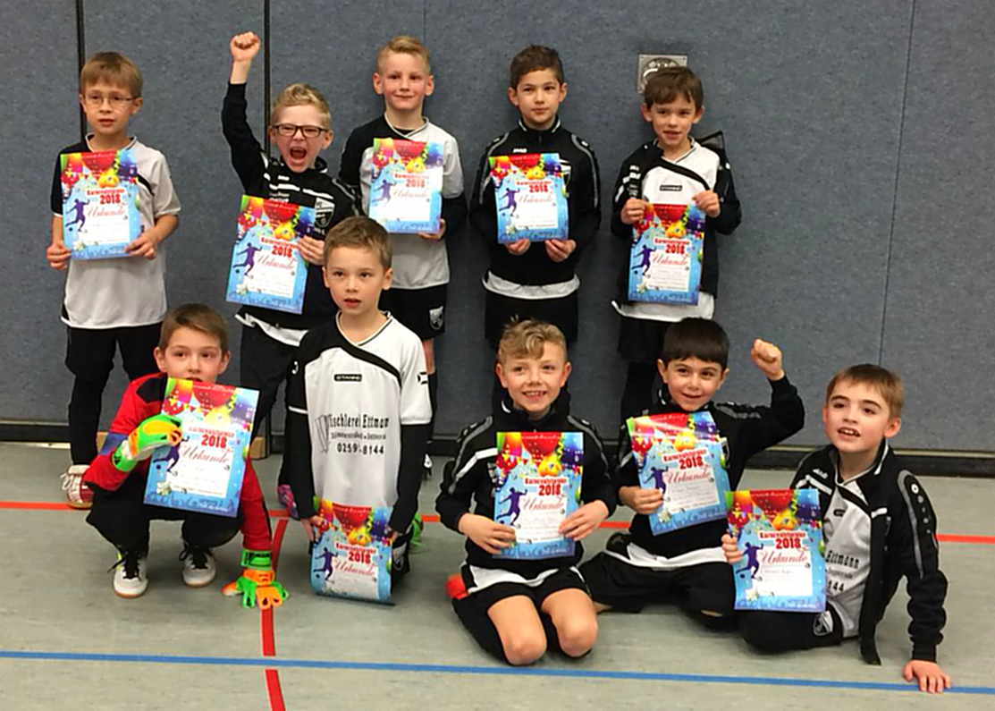 Unsere U8-I-Junioren haben am vergangenen Wochenende überaus erfolgreich am Karnevalsturnier in Ascheberg teilgenommen. Nach Siegen gegen SV Rinkerode, GW Marathon Münster, Werner SC und SV Herbern hatte das Team 12 Punkte und ein Torverhältnis von 16:2 am Ende des Turniers auf seinem Konto. Die Kinder fiebern jetzt auf das nächste Turnier am 18.2.2018 in Albersloh hin, das hoffentlich genauso erfolgreich abgeschlossen werden kann, um dann in das eigene Turnier am 04.03.2018 zu starten. (von Torsten Ulrich, Trainer)