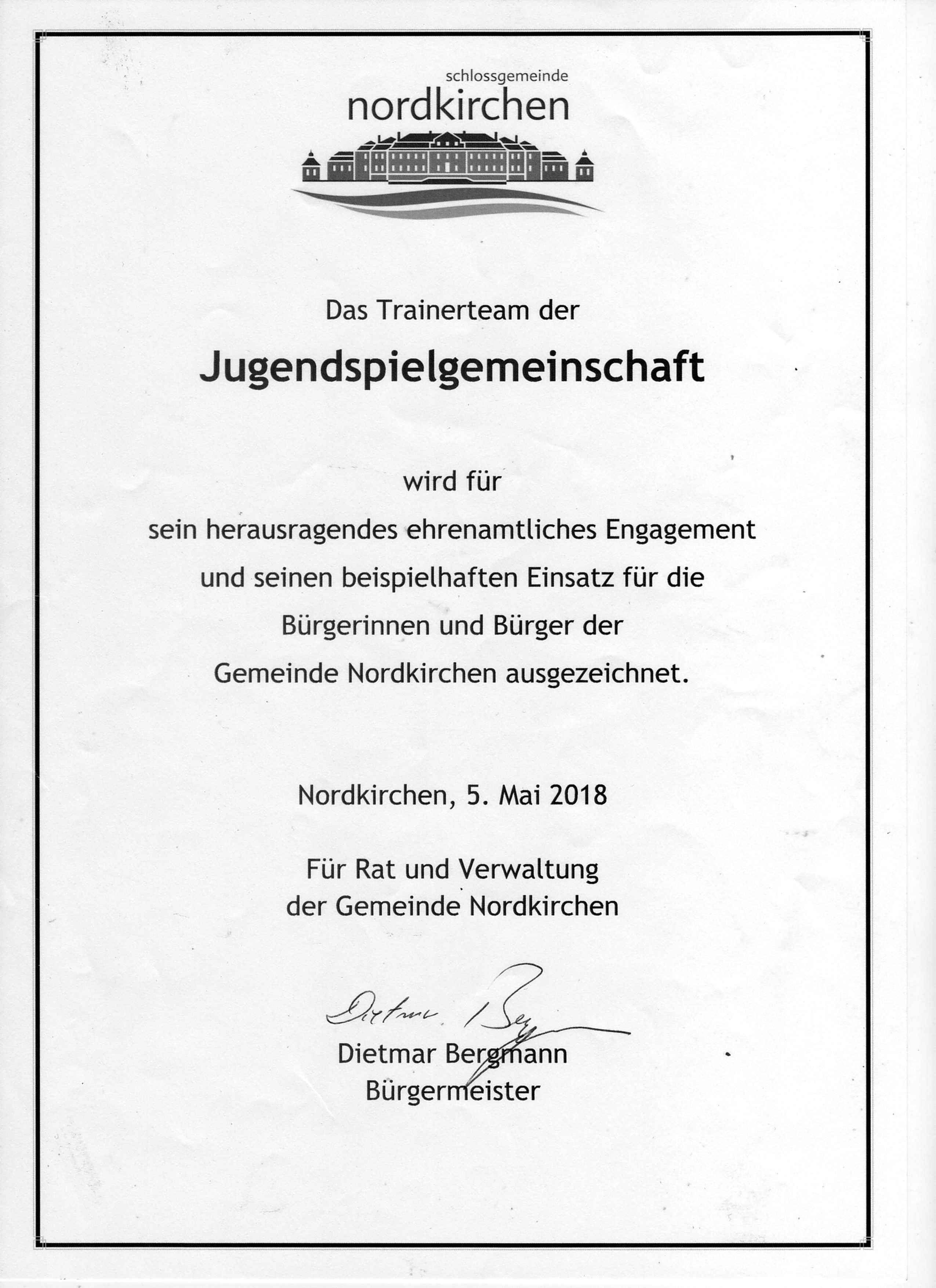 Für ihren engagierten Einsatz zum Wohle der Nordkirchener fußballbegeisterten Kids erhielt die JSG im Mai eine Auszeichnung der Gemeinde durch Bürgermeister Dietmar Bergmann. Im nun beginnenden 2. Jahr der JSG NordSüdCap hat ein Großteil der bewährten Trainer sich bereit erklärt, Ihre Tätigkeit fortzuführen. Trainer, die aus unterschiedlichen Gründen “ausgeschieden” sind, konnten durch kompetente Nachfolger ersetzt werden.
